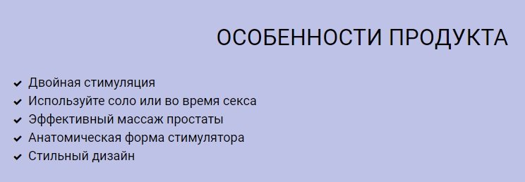 Одна часть игрушки — рельефный стимулятор с загнутой головкой — активно массирует предстательную железу.Вторая часть — массажер для интимной зоны — вызывает множественные оргазмы от стимуляции мошонки.